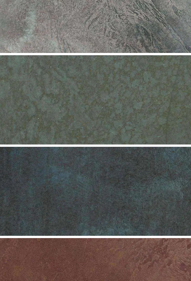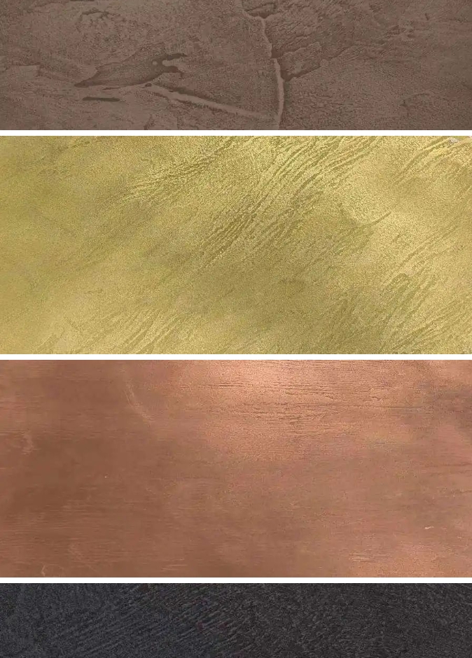 金屬微水泥根據(jù)所選擇的顏料和金屬粉末等成分的不同,可以組合出各種不同的效果并且還可以在做出的金屬效果上,進一步處理形成氧化表面的視覺效果。